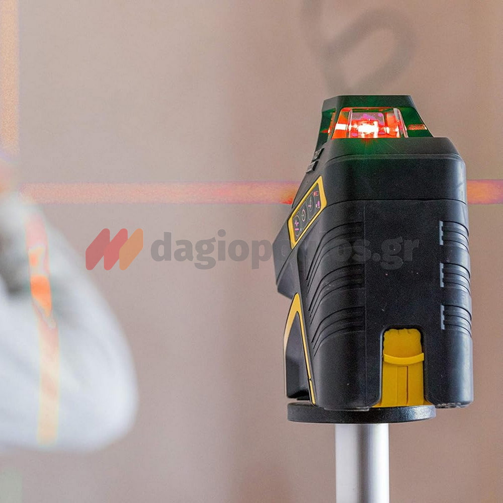 Αυτοεπιπεδούμενο με ακρίβεια ±3mm/10m, εμβέλεια έως 20m (50m με δέκτη), IP54 και σπειρώματα 1/4" & 5/8".