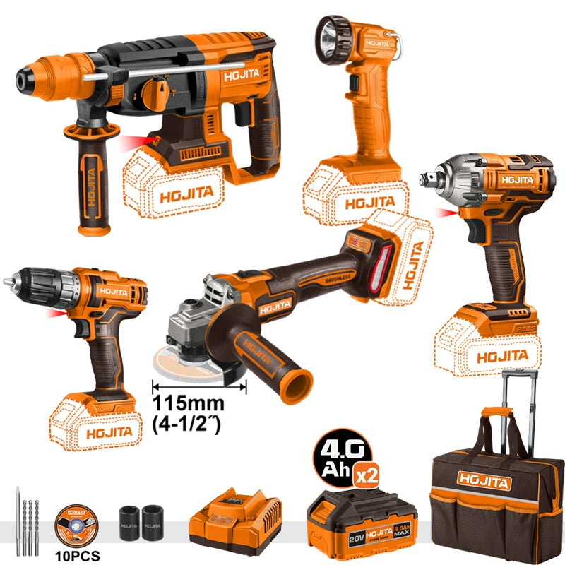 Το πακέτο περιλαμβάνει: περιστροφικό κρουστικό πιστολέτο, δραπανοκατσάβιδο, γωνιακό τροχό, μπουλονόκλειδο και φακό εργασίας – όλα βασισμένα στην κοινή πλατφόρμα 20V της Hojita.