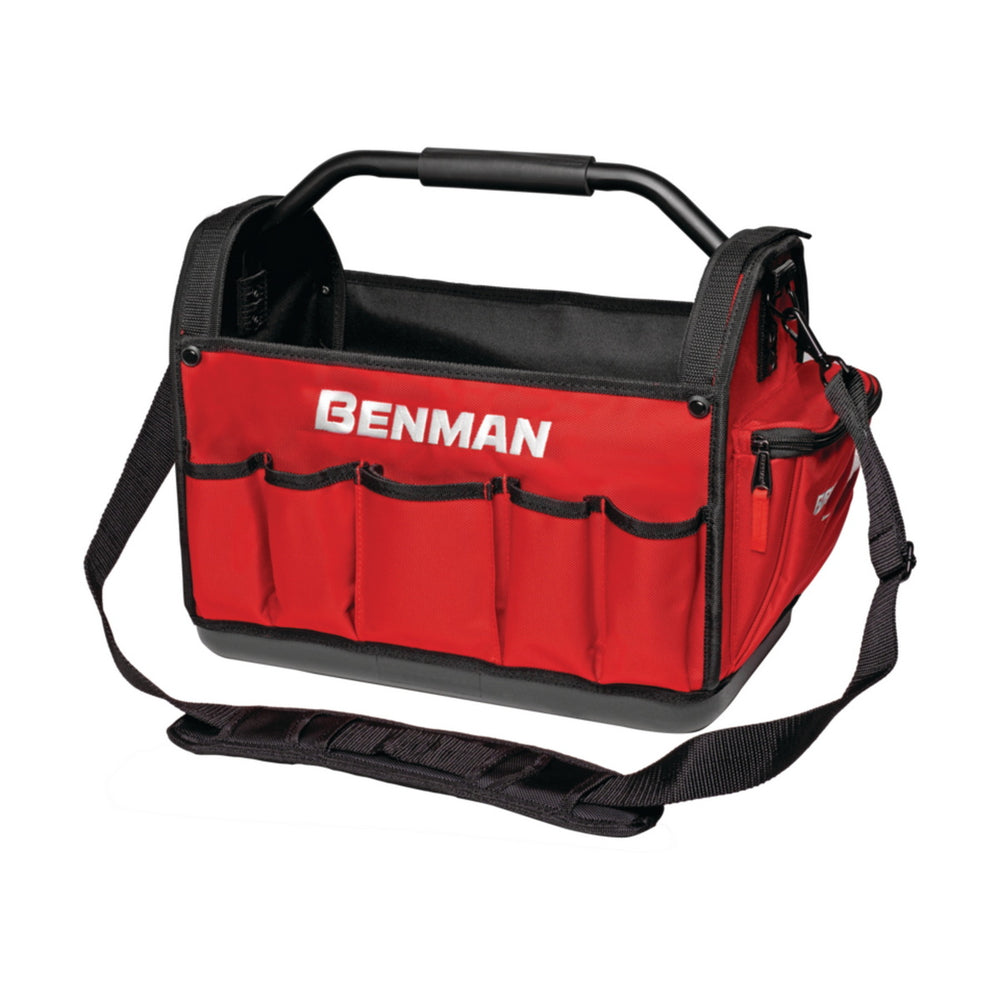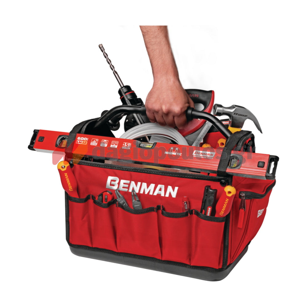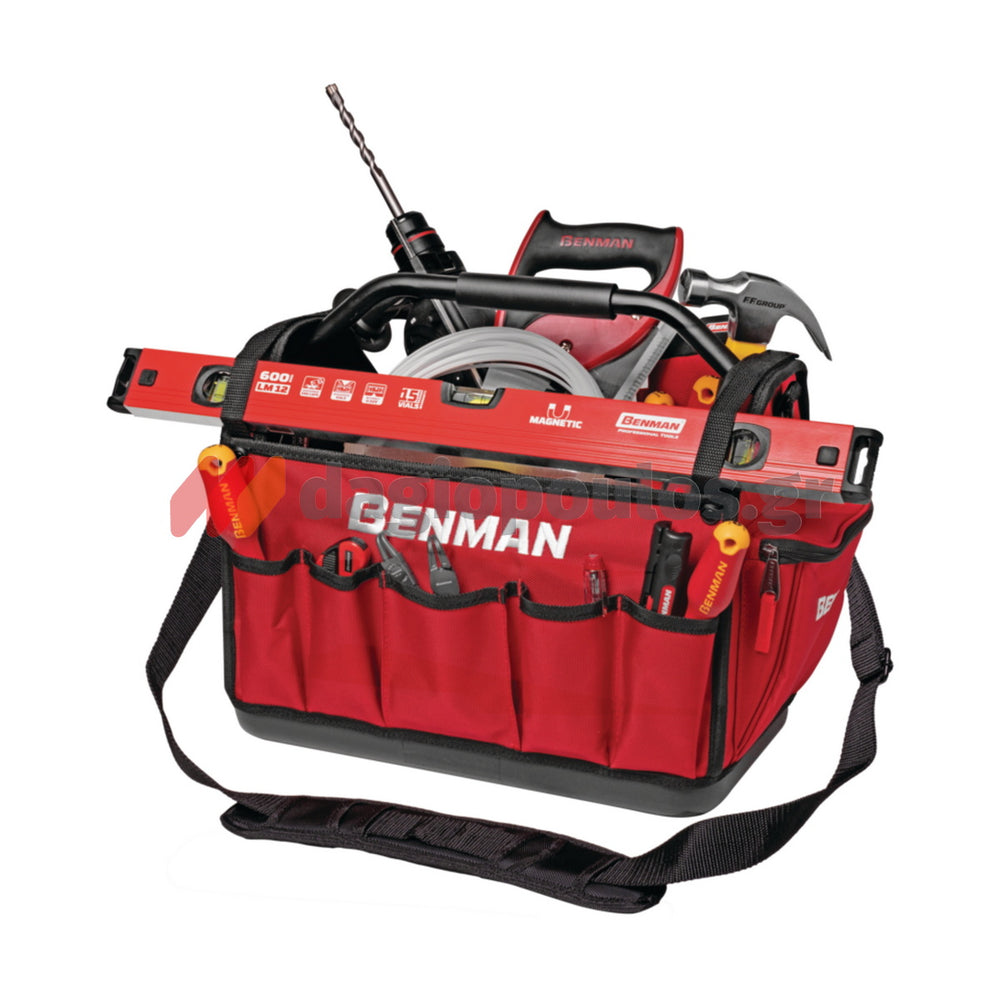 Σύνοψη: Πρακτική υφασμάτινη εργαλειοθήκη Benman 73195 ανοικτού τύπου με κεντρική χειρολαβή, σκληρή βάση και πλούσια οργάνωση, ιδανική για επαγγελματική μεταφορά και καθημερινή χρήση