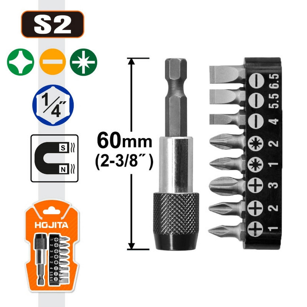 Το σετ Hojita HJBS5K09 περιλαμβάνει έναν μαγνητικό αντάπτορα και 8 μύτες διαφόρων τύπων, σχεδιασμένο για να καλύπτει ένα ευρύ φάσμα εργασιών βιδώματος.