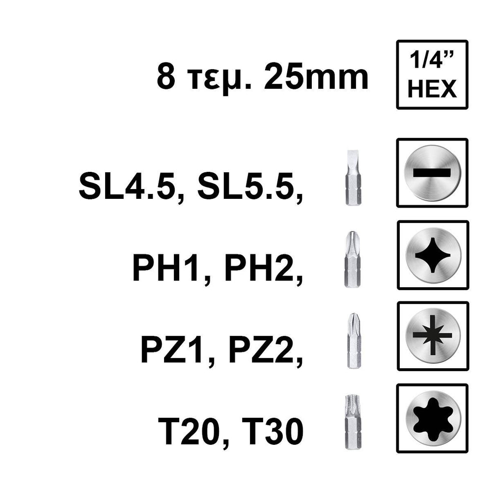 • 8 τεμ. Μύτες 25mm : SL4.5, SL5.5, PH1, PH2, PZ1, PZ2, T20, T30