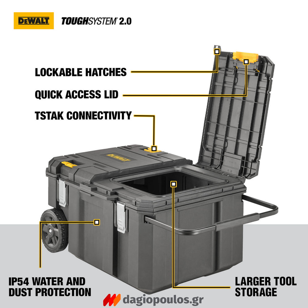 - Μεγάλος χώρος αποθήκευσης (113 L), ικανός να φιλοξενήσει τόσο μεγάλα εργαλεία όσο και εργαλειοθήκες TSTAK.