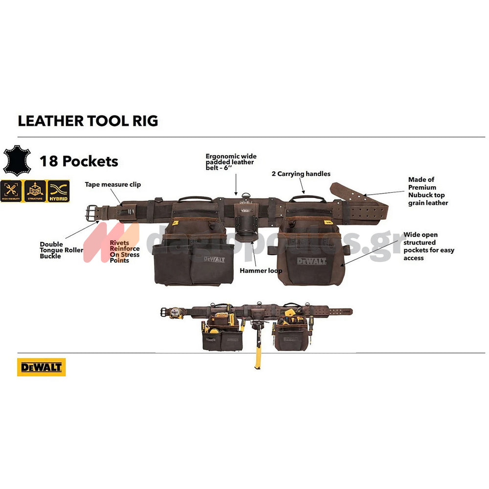 1 × DeWalt DWST50113‑1 Pro Leather Tool Rig με 18 θήκες, θήκη για μεζούρα, θηλιά σφυριού και χειρολαβές.