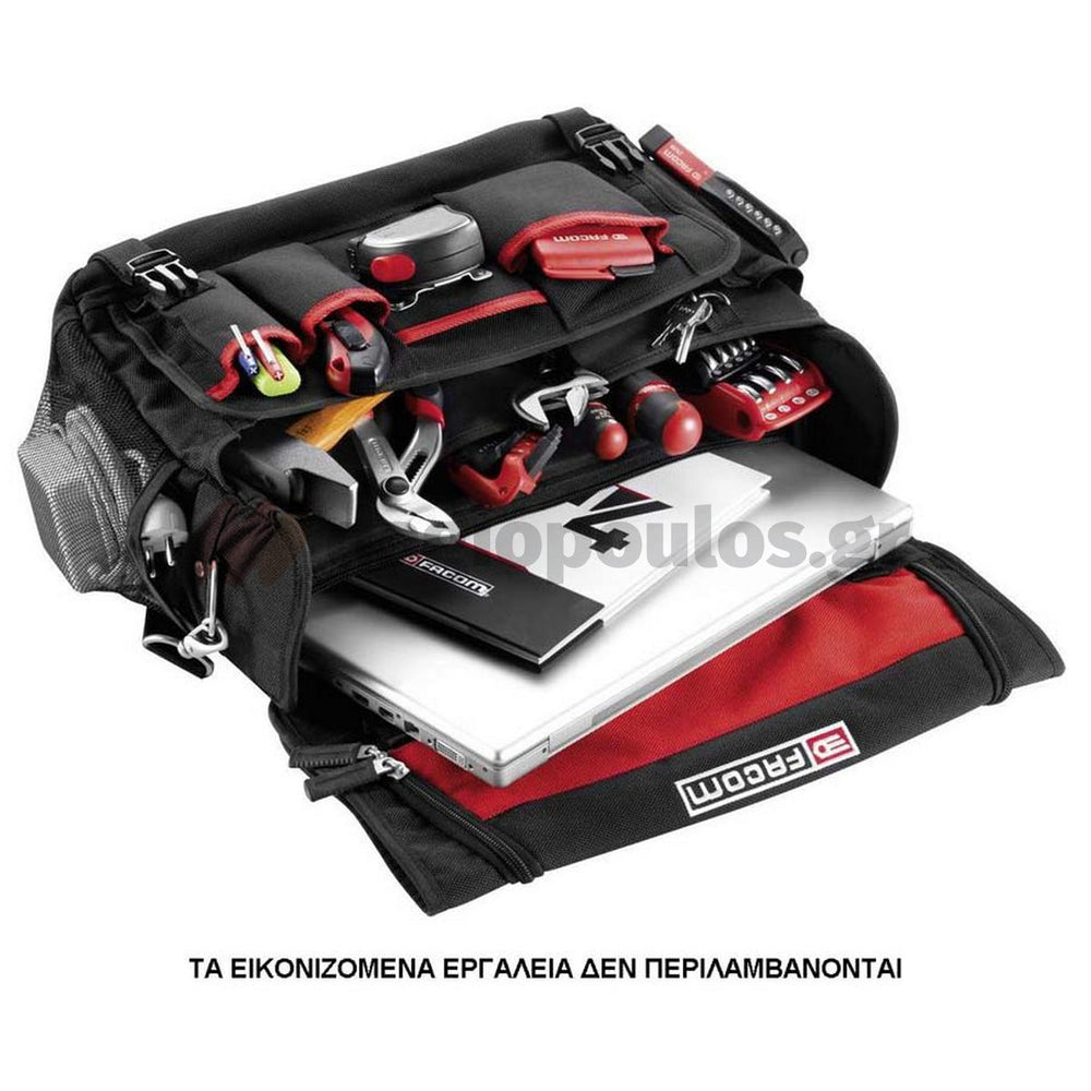 Κλειστή τσάντα εργαλείων ώμου με οργάνωση 14 θέσεων και επενδεδυμένη θήκη για φορητό έως 15", ιδανική για τεχνικούς που μετακινούνται.