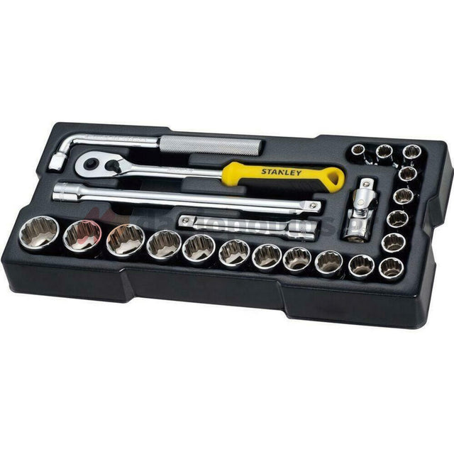 Το σετ καρυδάκια Stanley STMT1-74726 περιλαμβάνει 23 τεμάχια με θήκη Trans-Module, σχεδιασμένο για εύκολη οργάνωση και αποθήκευση.