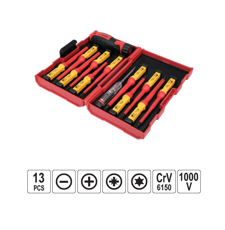 Περιλαμβάνει 11 μονωμένες μύτες, μια εργονομική λαβή και έναν ηλεκτρικό δοκιμαστή, όλα αποθηκευμένα σε ανθεκτική πλαστική θήκη.