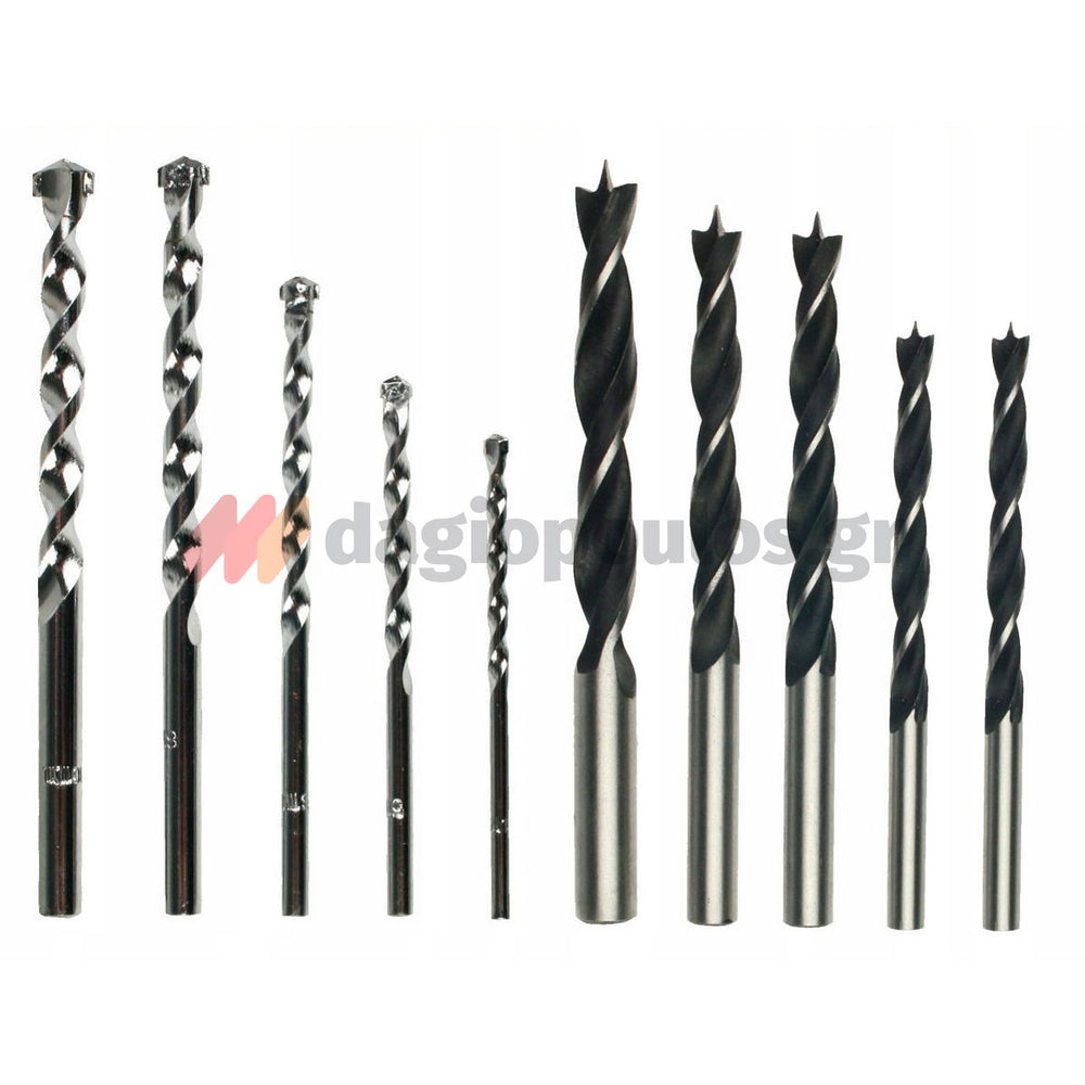 - Εξαρτήματα : 5 τρυπάνια ξύλου (Ø 6, 6, 8, 8, 10 mm) • 5 τρυπάνια τοιχοποιίας (Ø 4, 5, 6, 8, 10 mm) • Πλαϊνή λαβή • Οδηγός βάθους
