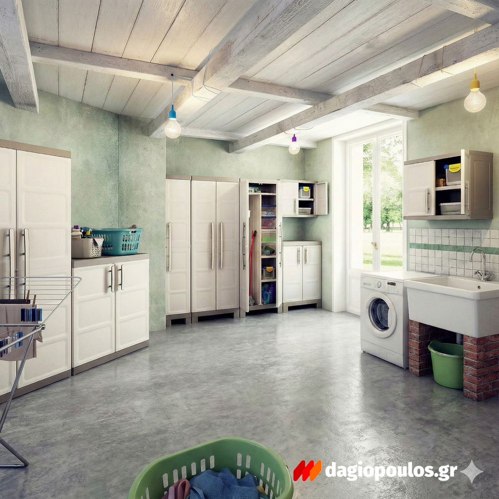Η κατασκευή από πολυπροπυλένιο εξασφαλίζει αντοχή σε υγρασία, ήλιο και χτυπήματα, διατηρώντας σταθερή την εμφάνιση της ντουλάπας.