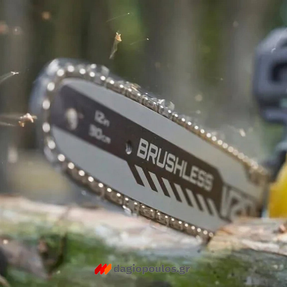 Η ασφάλεια αυξάνεται σε υψηλότερο επίπεδο από το σύστημα πέδησης αλυσίδας, το οποίο παρέχει βέλτιστη προστασία για τον χρήστη. Αυτή η λειτουργία, σε συνδυασμό με την ισχύ 18 V του κινητήρα, καθιστά δυνατή την εκτέλεση έως και 70 κοπών (4x4"), καθιστώντας το πριόνι κατάλληλο για εντατικές και απαιτητικές εργασίες πριονίσματος. Με εντυπωσιακή ικανότητα κοπής 30 cm, το αλυσοπρίονο V20 Brushless είναι σχεδιασμένο για εργασίες πριονίσματος μεσαίου έως μεγάλου μεγέθους, όπου η απόδοση και η αξιοπιστία είναι πρωταρχικής σημασίας. Η προσθήκη μιας δεύτερης μεγάλης λαβής με διακοπή έκτακτης ανάγκης αυξάνει τον έλεγχο και την ασφάλεια κατά την εργασία, καθιστώντας το πριόνι τον ιδανικό σύντροφο για επαγγελματίες χρήστες.