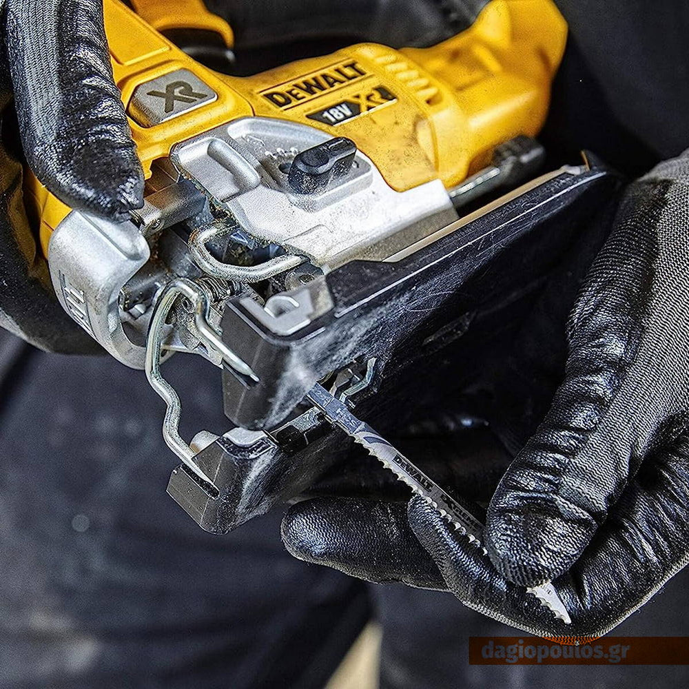 Δέχεται λάμες T-Shank για ξύλο, μέταλλο και πλαστικά. Επιλέγεται κατάλληλη οδόντωση/πάχος ανά υλικό και ποιότητα κοπής.