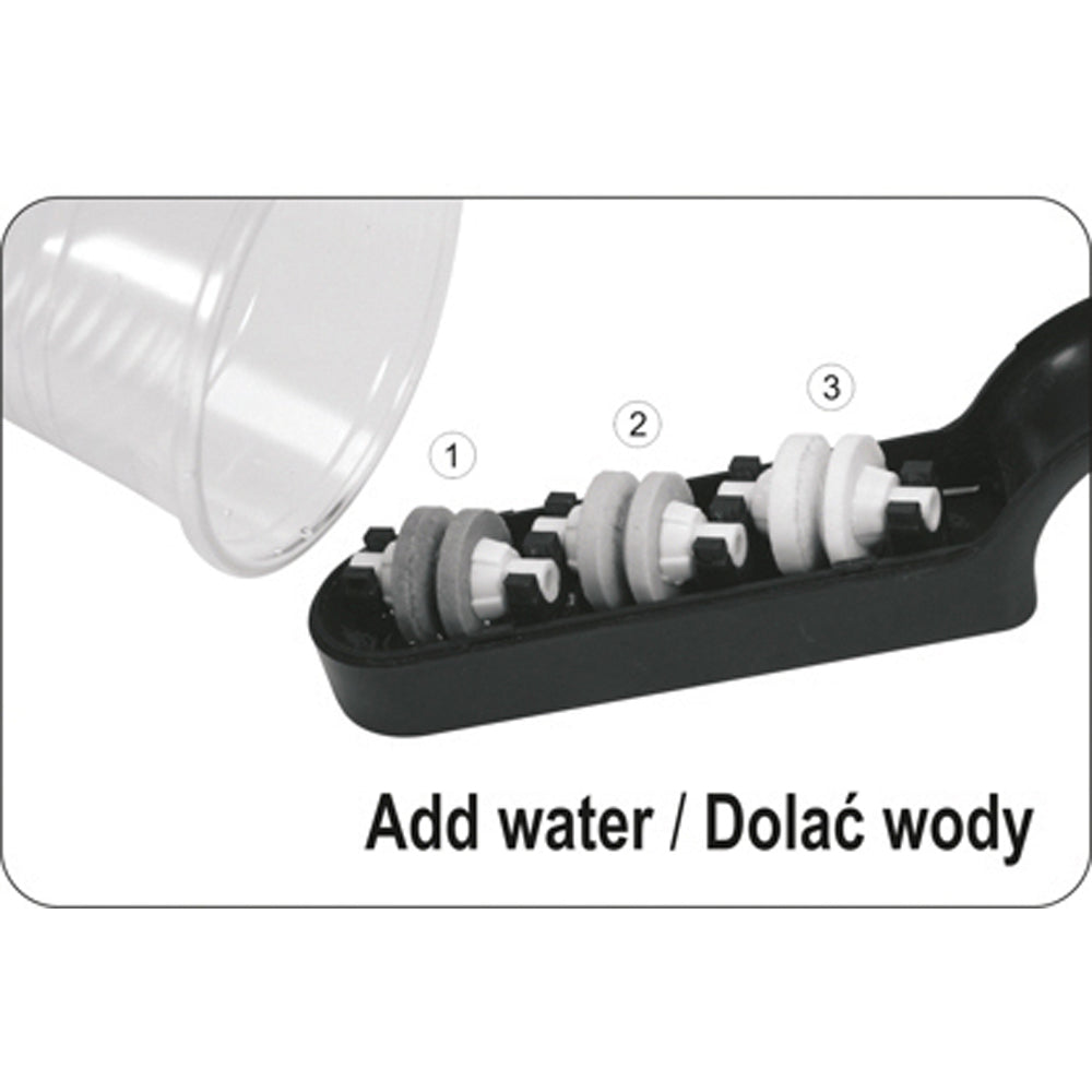 ΕΡΓΑΛΕΙΟ ΑΚΟΝΙΣΜΑΤΟΣ ΜΕ ΛΑΒΗ 3 ΣΤΑΔΙΩΝ Εργαλείο ακονίσματος με τρεις διπλούς δίσκους διαφορετικής σκληρότητας σχεδιασμένους για αποτελεσματικό ακόνισμα μαχαιριών και άλλων παρόμοιων εργαλείων. Το σώμα, κατασκευασμένο από πλαστικό ανθεκτικό στις ζημιές, λειτουργεί επίσης ως δεξαμενή νερού. Οι λειαντικοί δίσκοι λειτουργούν "υγροί", αυξάνοντας την αποτελεσματικότητα της ακονίσματος. Οι δίσκοι ξύστρας που κατασκευάζονται είναι, ανάλογα με το σκοπό τους, κατασκευασμένοι από κεραμικό υλικό, αλουμίνα χρωμίου και οξείδιο του αργιλίου. Αυτό εγγυάται βέλτιστα αποτελέσματα προ-ακονίσματος και λεπτής όξυνσης. Οι σωστά επιλεγμένες γωνίες δίσκου, οι σχισμές οδηγών λεπίδων και η χρήση νερού, εξασφαλίζουν αποτελεσματικό, ακριβές ακόνισμα. Χαρακτηριστικά : Σώμα από πλαστικό ανθεκτικό στις ζημιές χρησιμεύει ως δεξαμενή νερού Δίσκοι ακονίσματος διαφορετικής σκληρότητας κατασκευασμένοι από κεραμικό υλικό, κορούνδιο χρωμίου και οξείδιο του αργιλίου Για αρχικό και λεπτό ακόνισμα μαχαιριών Μήκος 180 mm Λειαντικό κορούνδιο χρωμίου, οξείδιο αργιλίου Υλικό PVC Τρόπος χρήσης: ανοίξτε την ασπίδα των λεπίδων, γεμίστε το δοχείο με νερό, κλείστε την ασπίδα Τοποθετήστε τη λεπίδα στην αντίστοιχη υποδοχή οδηγού με ομαλές κινήσεις κινηθείτε, πιέζοντας ελαφρά