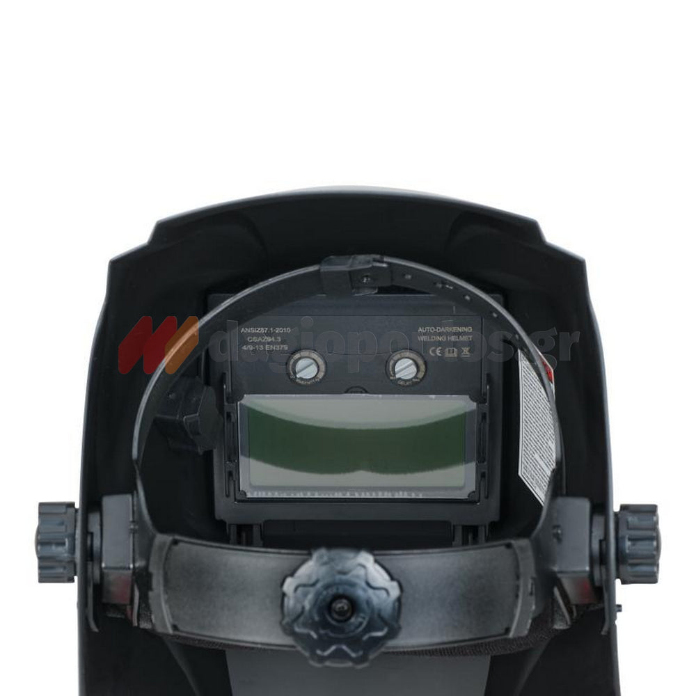 Ηλεκτρονική μάσκα ηλεκτροσυγκολλητών, αυτόματη με δύο φωτοκύτταρα και ρυθμίσεις βαθμού σκίασης και χρόνου απόκρισης.