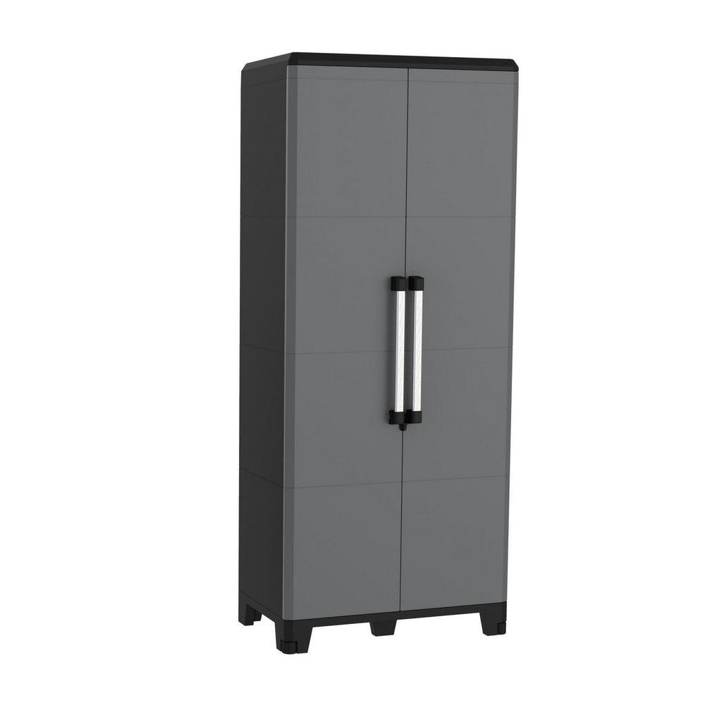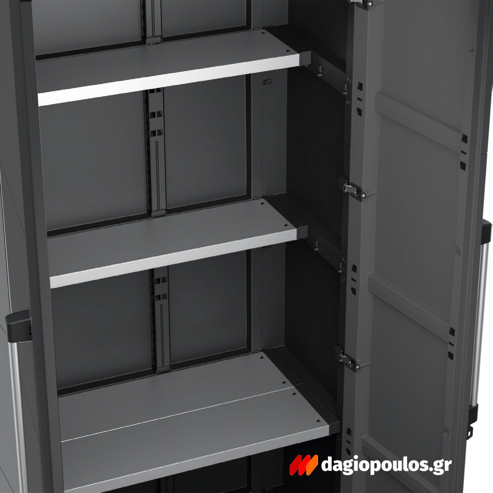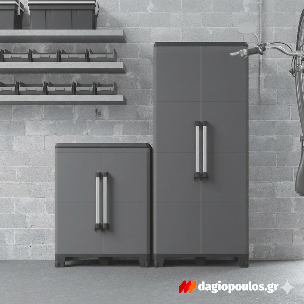 Με δύο πόρτες και τρία ρυθμιζόμενα ράφια, εξασφαλίζει στιβαρή και οργανωμένη αποθήκευση εργαλείων, καθαριστικών, κηπουρικών ή ειδών γκαράζ. Ο εργονομικός σχεδιασμός και η σταθερή βάση προσφέρουν ασφάλεια και ευκολία χρήσης.