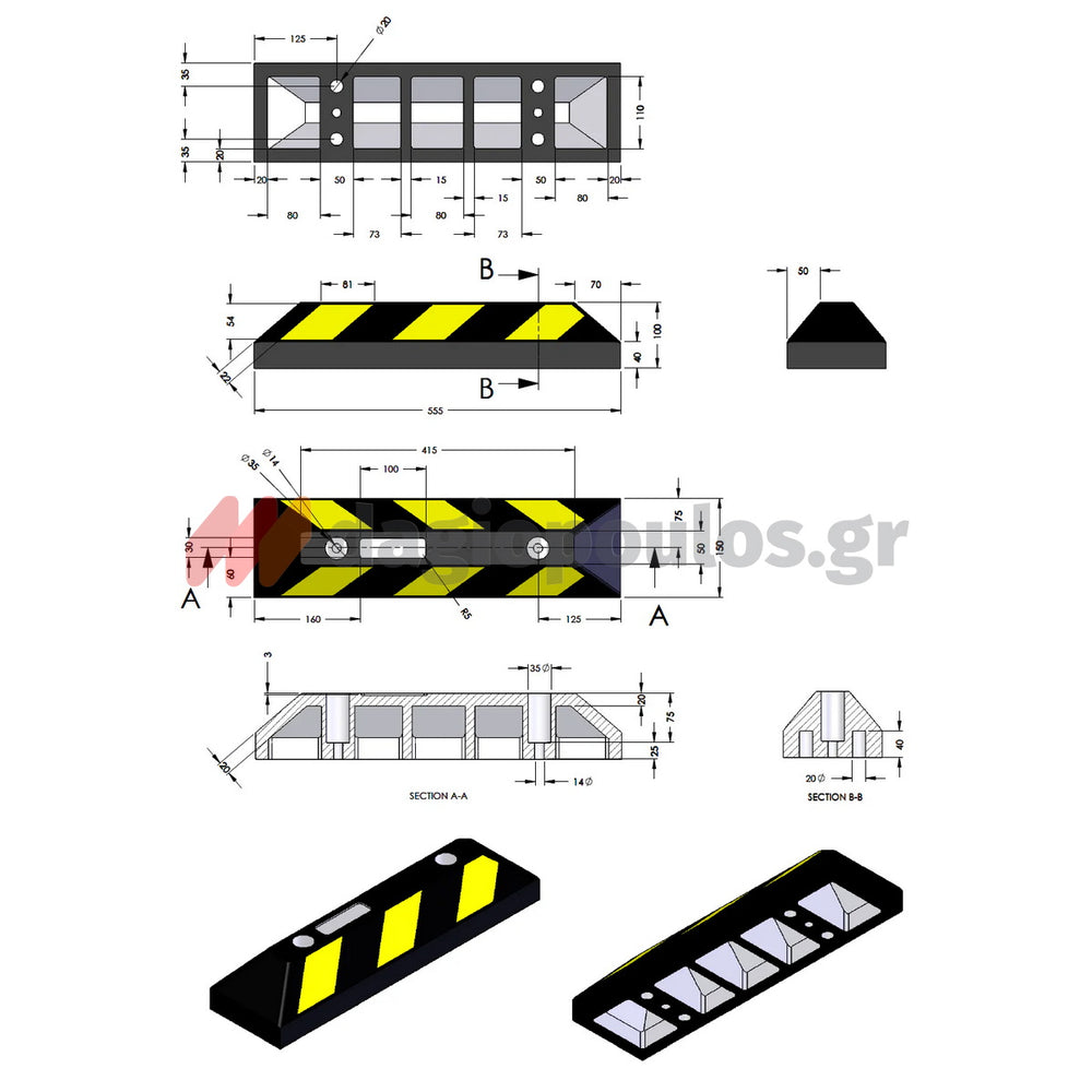 Στοπ Τροχού Μονό Ενισχυμένο Μασίφ Με Αντανακλαστικό 550mm x 150mm x 100mm