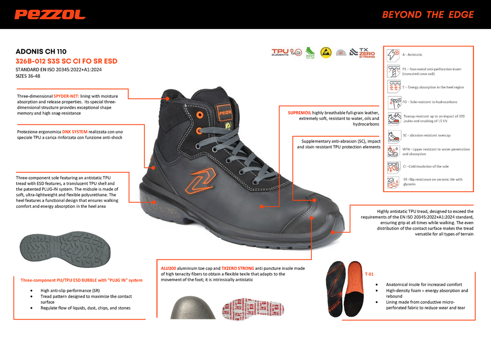 Το Pezzol ADONIS CH 110 συνδυάζει ελαφρύ καπάκι αλουμινίου, υφασμάτινη αντιδιάτρηση TXZERO STRONG και τριπλή εξωτερική σόλα BUBBLE PU/TPU με PLUG-IN για κράτημα SR, άνεση και ESD προστασία.