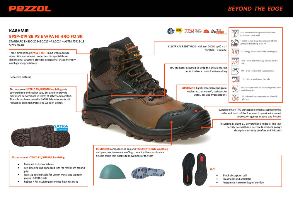 - Σόλα : PU/καουτσούκ μονωτική, ελαστική, με απορρόφηση κραδασμών, HRO και HI.