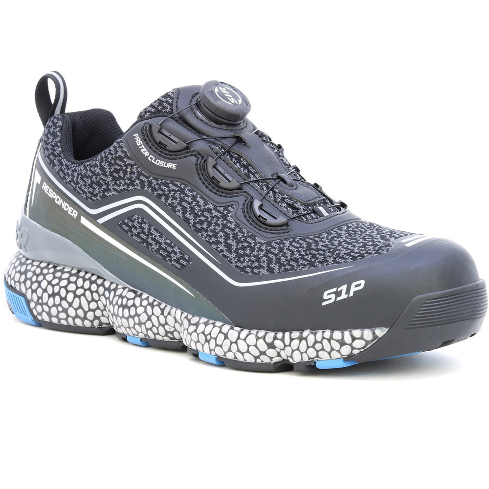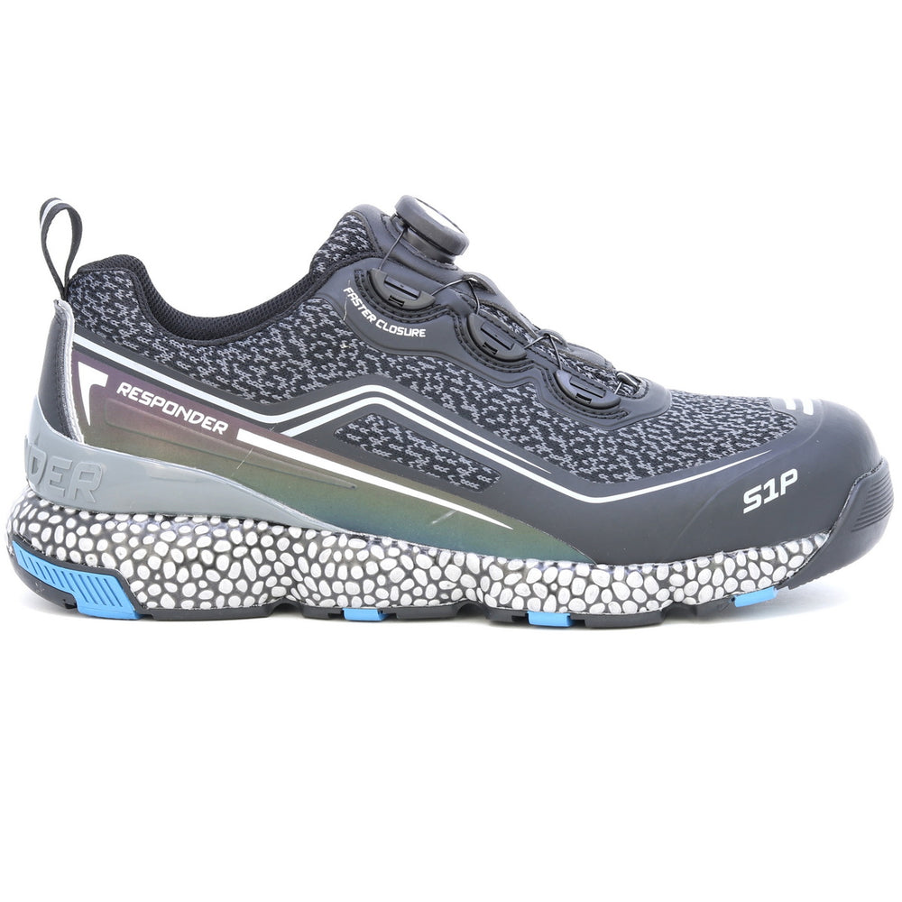 Το κάλυμμα δακτύλων αλουμίνιο 200J συνδυάζεται με σύνθετη αντιδιάτρηση PS-Type σταθερού πάχους για μέγιστη ασφάλεια, ενώ η εξωτερική σόλα E-TPU Responder/καουτσούκ με βαθιές αυλακώσεις προσφέρει αντιολισθητική απόδοση SR.
