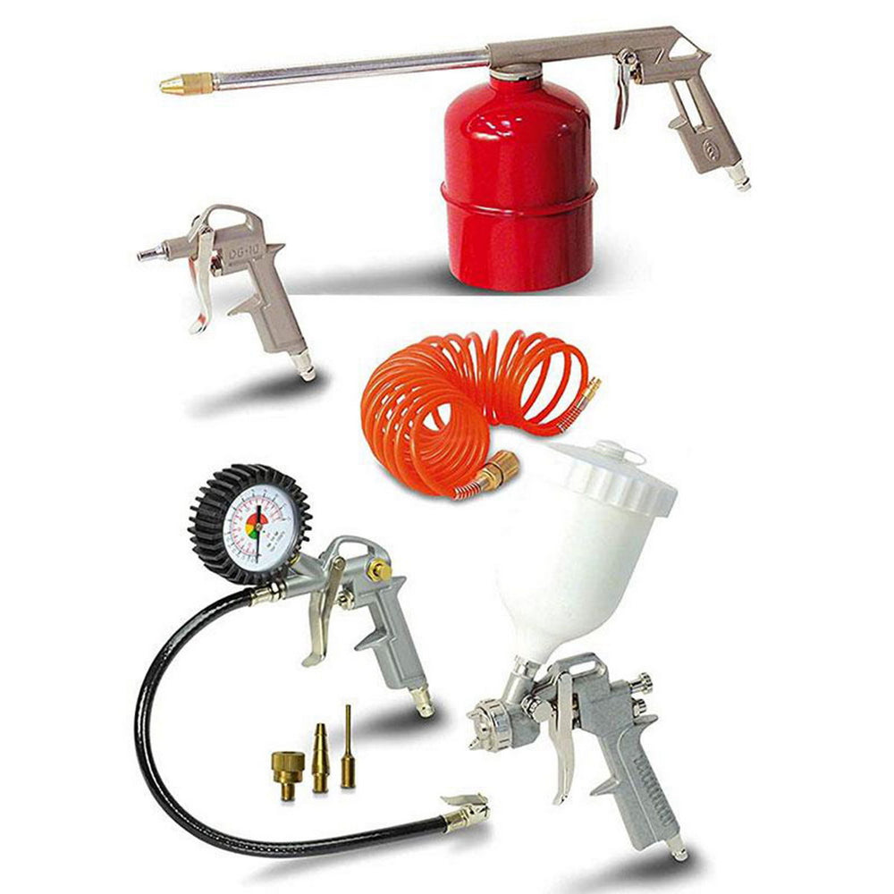 - Το σετ περιλαμβάνει 6 τεμάχια : Πιστόλι αέρος για λάστιχα με αερόμετρο. Πιστόλι - φυσητήρα. Πιστόλι πετρελαίου Πιστόλι βαφής Σπιράλ σωλήνα 5 μέτρων με άκρα ταχυσύνδεσμου. 3 διαφορετικά ακροφύσια.