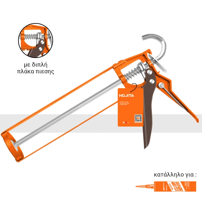 Το Hojita HJCG3109 είναι ένα πιστόλι σιλικόνης χειρός μήκους 230mm, ιδανικό για την εφαρμογή σφραγιστικών υλικών, σιλικόνης και ακρυλικών σε φυσίγγες.