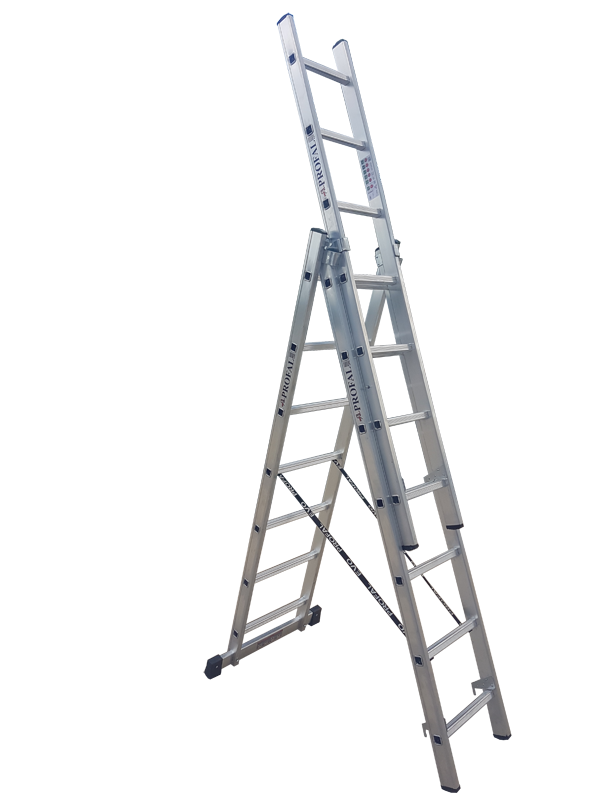 Τριπλή σκάλα αλουμινίου που μπορεί να μετατραπεί σε μονή και διπλή, ιδανική για επαγγελματική και οικιακή χρήση. Είναι κατασκευασμένη αποκλειστικά από την εταιρεία μας σύμφωνα με τα ευρωπαϊκά πρότυπα ΕΝ131.