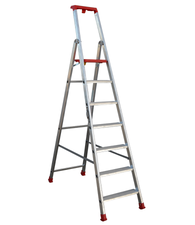 Ενισχυμένη σκάλα αλουμινίου με πλατύσκαλο και προστατευτική κούρμπα, ιδανική για επαγγελματική και οικιακή χρήση. Είναι κατασκευασμένη σύμφωνα με τα ευρωπαϊκά πρότυπα ΕΝ131.