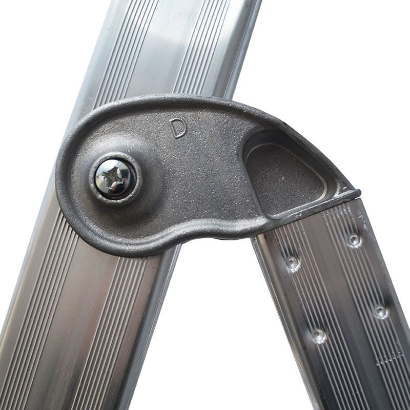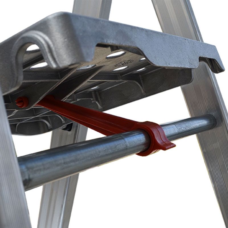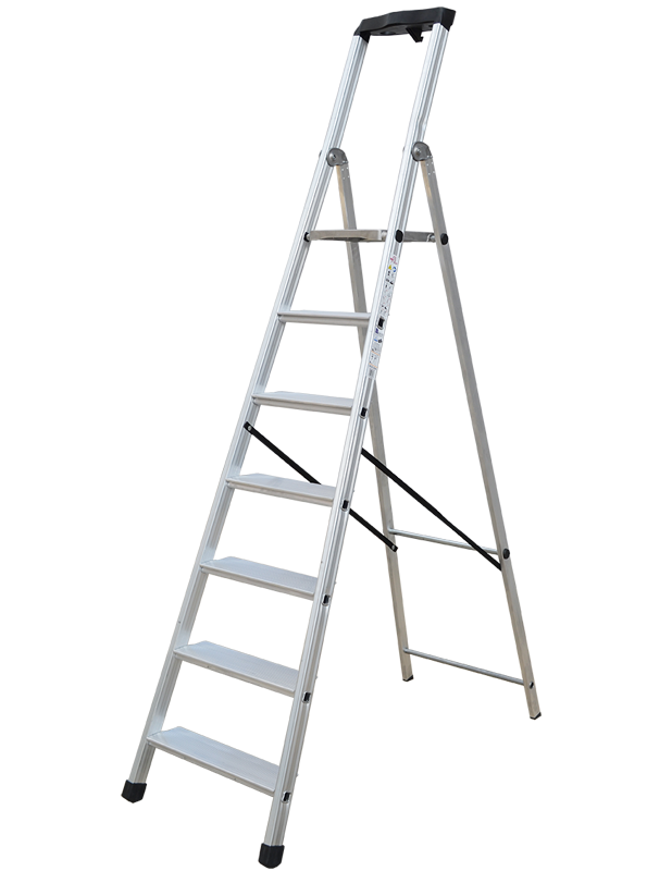 Σκάλα αλουμινίου με πλατύσκαλο και προστατευτική κούρμπα, ιδανική για επαγγελματική και οικιακή χρήση. Είναι κατασκευασμένη σύμφωνα με τα ευρωπαϊκά πρότυπα ΕΝ131.