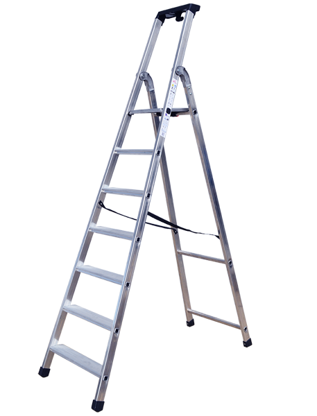 Σκάλα αλουμινίου με πλατύσκαλο και προστατευτική κούρμπα, ιδανική για επαγγελματική και οικιακή χρήση. Είναι κατασκευασμένη σύμφωνα με τα ευρωπαϊκά πρότυπα ΕΝ131.