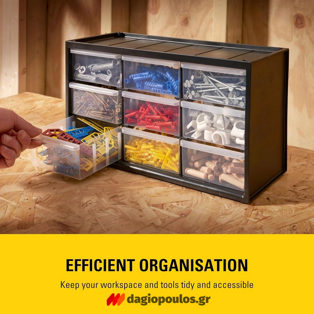 • Οργανωμένη Αποθήκευση: Τα 9 ξεχωριστά συρτάρια επιτρέπουν εύκολη ταξινόμηση και γρήγορη πρόσβαση σε μικροαντικείμενα και εργαλεία.