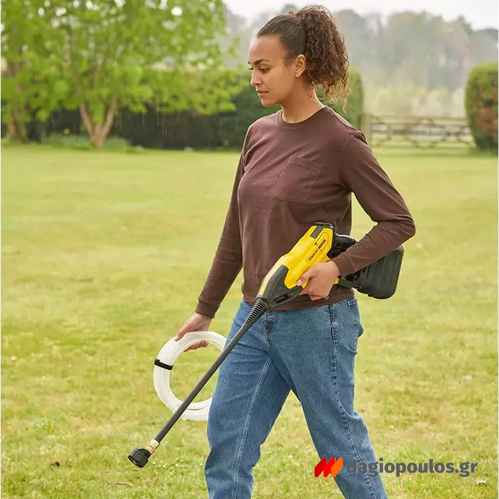 - Συνδέστε σε έναν τυπικό σωλήνα κήπου για να αντλήσετε νερό από οποιαδήποτε πηγή, όπως ένα κουβά, λίμνη, ποτάμι ή πισίνα Μέρος του νέου ασύρματου συστήματος 18V STANLEY® FATMAX® V20
