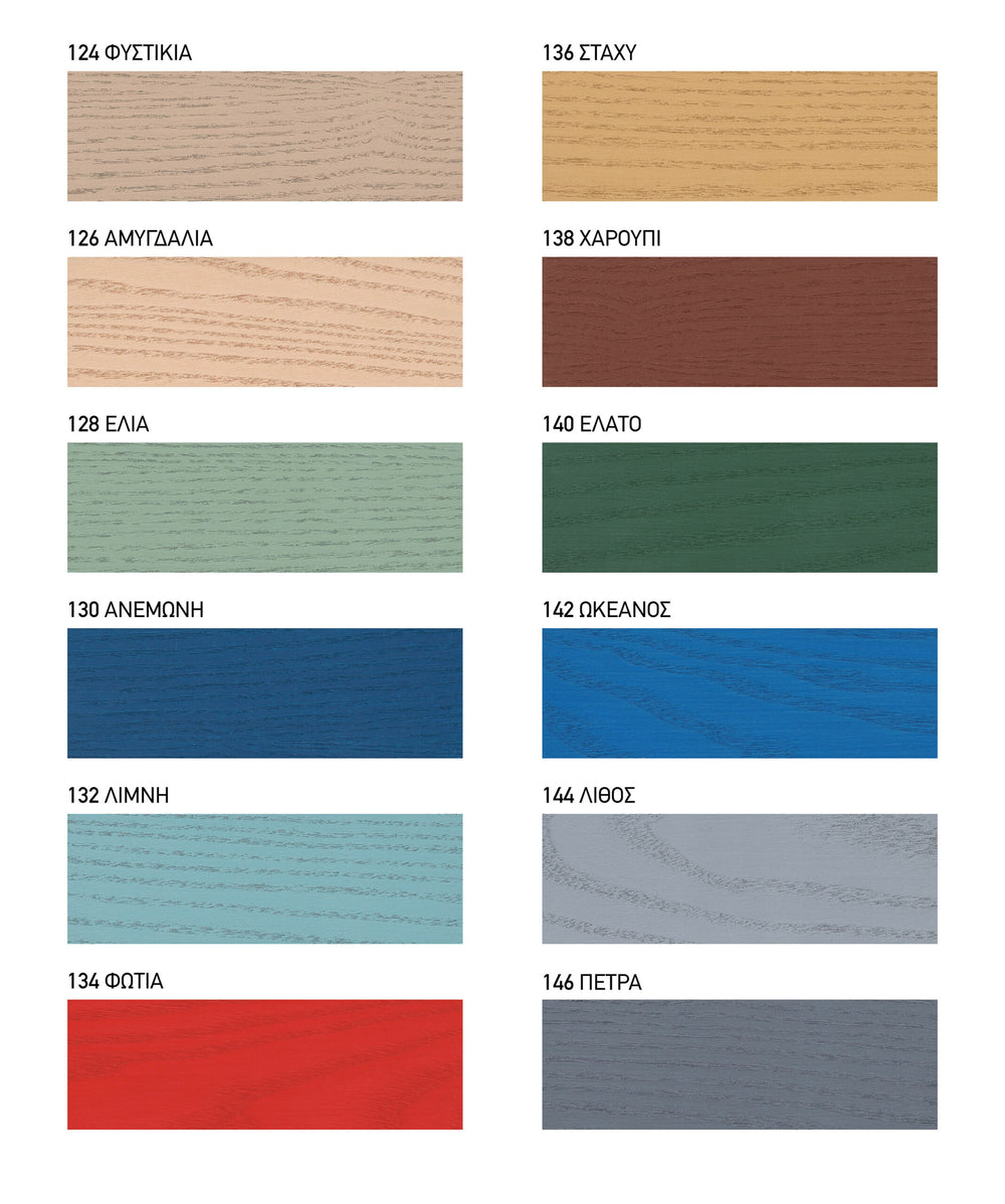 • Αποχρώσεις : Διαφανές και σε 12 αποχρώσεις χρωματολογίου. Η τελική απόχρωση του ξύλου εξαρτάται από το αρχικό χρώμα και την ηλικία του.
