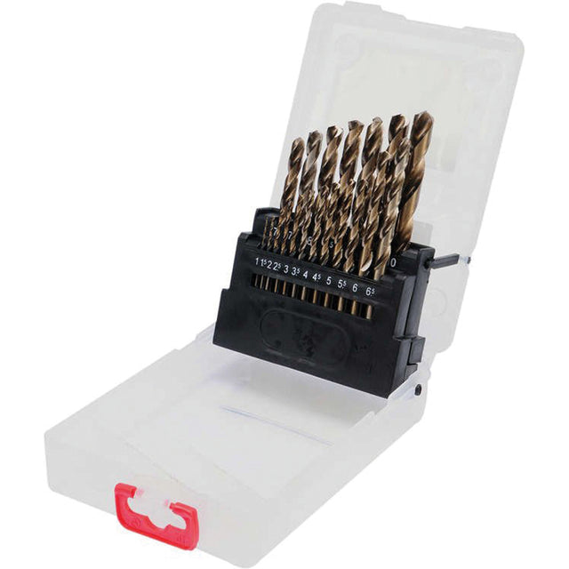 ΤΡΥΠΑΝΙΑ ΚΟΒΑΛΤΙΟΥ ΣΥΛΛΟΓΗ Τρυπάνια κοβαλτίου Co-HSS μετάλλων για ακριβές τρύπημα σε δύσκολα υλικά, π.χ. ανοξείδωτο χάλυβα, μη σιδηρούχα μέταλλα, πλαστικά, ανοξείδωτους και ανθεκτικούς στα οξέα χάλυβες, ανθεκτικό σε υψηλή θερμοκρασία αλλά και ξύλο Χαρακτηριστικά : Τρυπάνια με ενισχυμένο άκρο κοπής και γωνία στροφής 135°. Υλικό: κοβάλτιο To set περιλαμβάνει 19 τεμάχια : 1; 1,5; 2; 2,5; 3; 3,5; 4; 4,5; 5; 5,5; 6; 6,5; 7; 7,5; 8; 8,5; 9; 9,5; 10mm Σε πρακτική θήκη μεταφοράς & φύλαξης