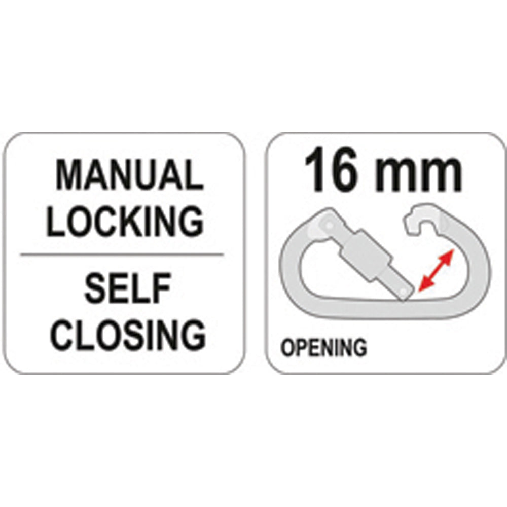 ΚΡΙΚΟΣ ΑΣΦΑΛΕΙΑΣ Το αυτοασφαλιζόμενο καραμπίνερ YT-74229 με χειροκίνητο κλείδωμα μέσω βίδας αποτελεί μέρος του συστήματος ανακοπής πτώσης. Το καραμπίνερ χρησιμοποιείται ως συνδετήρας για στοιχεία όπως ιμάντες ασφαλείας, σχοινιά, πετονιές, βοηθητικές ταινίες, καθώς και για το αμορτισέρ. Χαρακτηριστικά : Αυτοασφαλιζόμενο καραμπίνερ Άνοιγμα 16mm Χειροκίνητο κλείδωμα μέσω βίδας Χρησιμοποιείται ως συνδετήρας για στοιχεία όπως ιμάντες ασφαλείας, σχοινιά, πετονιές, βοηθητικές ταινίες, καθώς και για το αμορτισέρ. Μέγιστο άνοιγμα: 16 mm Διάμετρος: 10 mm Στατική αντοχή: 22 KN Πιστοποίηση από την ΕΕ και πληρεί τις απαιτήσεις του EN 362: 2004, κατηγορίας Β. Μελετημένα & κατασκευασμένα από επαγγελματίες για επαγγελματίες Ασφάλεια & Νομοθεσία Εργασία σε ύψος είναι η εργασία που εκτελείται σε επίπεδο μεγαλύτερο από 1 μέτρο πάνω από το ισόγειο / δάπεδο, η επιφάνεια της οποίας δεν περιβάλλεται από όλες τις πλευρές από συμπαγείς τοίχους ή προστατευτική κατασκευή ύψους έως 1,5 μέτρων. Εάν, υπό τέτοιες συνθήκες, δεν είναι δυνατή η εφαρμογή μέτρων συλλογικής προστασίας, ο εργοδότης, κατά την ανάθεση εργασίας, θα πρέπει, μεταξύ άλλων, να παρέχει ατομικό προστατευτικό εξοπλισμό. Κάθε κομμάτι εξοπλισμού προστασίας από πτώση θα πρέπει να πληροί ορισμένα πρότυπα ασφαλείας, τα οποία ο κατασκευαστής επιβεβαιώνει μόνο μέσω εργαστηρίου δοκιμών διαπιστευμένο από την ΕΕ. Η επιβεβαίωση της συμμόρφωσης με τα πρότυπα εγγυάται πρωτίστως την ασφάλεια του χρήστη, αλλά και προστατεύει τόσο τον εργαζόμενο όσο και τον εργοδότη από οικονομικές συνέπειες που προκύπτουν από κυρώσεις που επιβάλλονται από το ίδρυμα επιθεώρησης εργασίας. Όλα τα στοιχεία του εξοπλισμού προστασίας από πτώση YATO διαθέτουν ενημερωμένες δοκιμές που επιβεβαιώνουν τη συμμόρφωση με τα πρότυπα ασφαλείας και η χρήση τους σύμφωνα με τις οδηγίες εγγυάται 5 χρόνια αξιόπιστης λειτουργίας. Ο ΧΡΟΝΟΣ ΙΣΧΥΟΣΗ διάρκεια ζωής του αμορτισέρ ασφαλείας είναι πέντε χρόνια, υπολογίζεται από την πρώτη χρήση.